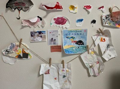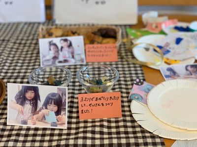 作品だけでなく、作っている様子のわかる写真や私からのコメントも一緒に置いたり、自粛期間におうちでいろいろな遊びをした思い出写真も一緒に飾りました。