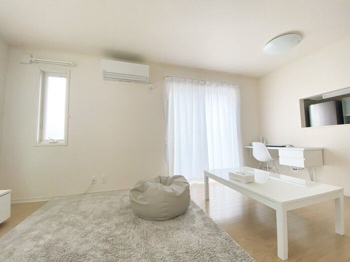 シャッターがないおうちの場合は、白のカーテンや白に近いカーテンをつけて壁の色と同化させると部屋が明るくなり広く見せることができます。