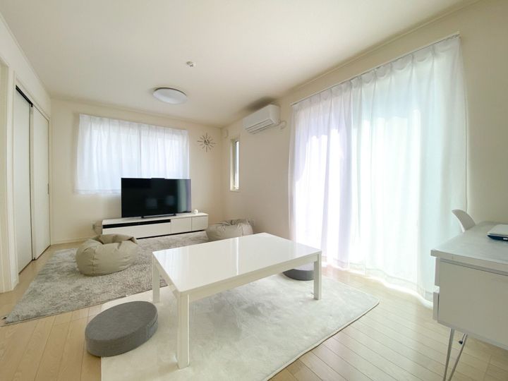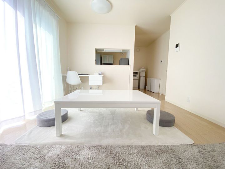 テレビの前に大きなラグを敷いてくつろぎスペース、こたつテーブルの下はなにも敷いていませんでした。