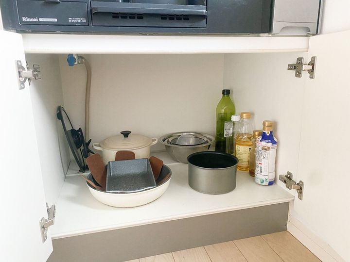 鍋やフライパンはここに平置きで収納しています。