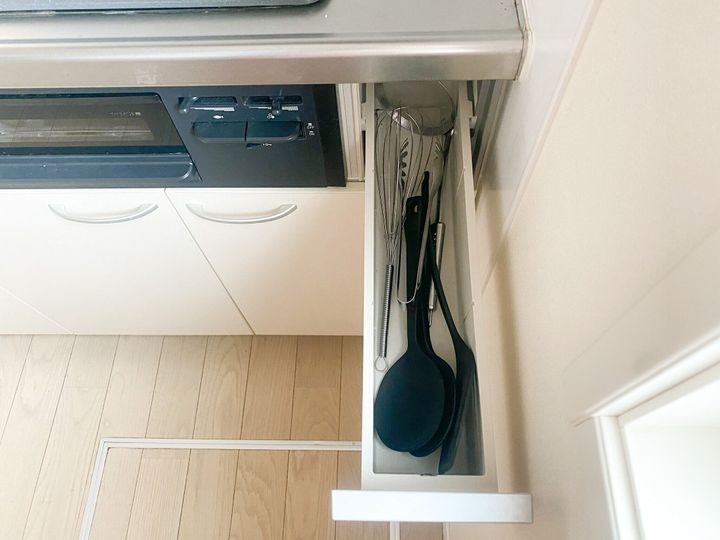 ここに収納することで調理中でもさっと取れて、ごちゃつきのないスッキリとしたキッチンになります。