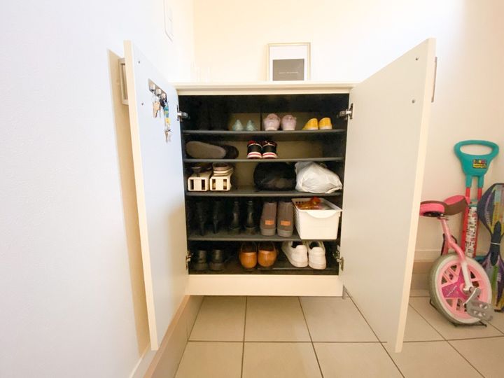 なので靴箱はいつもぎゅうぎゅうで、入りきらなくなった靴は新たに収納棚を設けて置いて、玄関を狭くしていました。