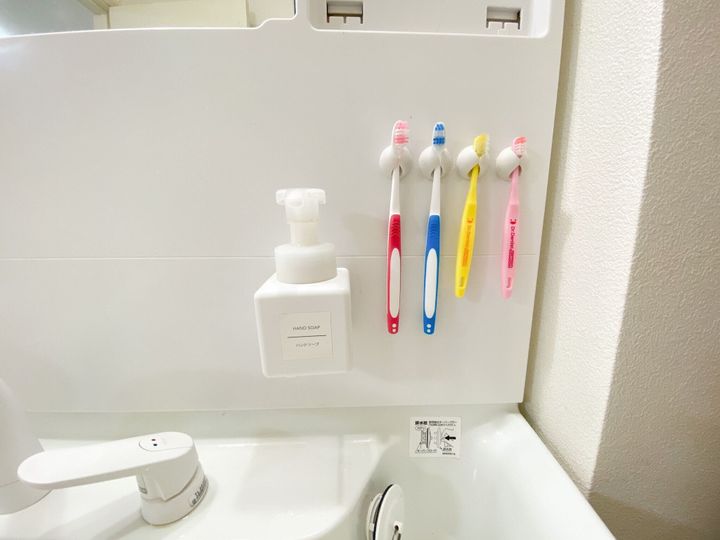 洗面台では、キャンドゥで購入したコードクリップに歯ブラシを引っ掛けて収納し、