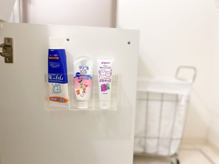 ちなみに歯磨き粉は洗面台の下の棚の扉に収納してあります。
