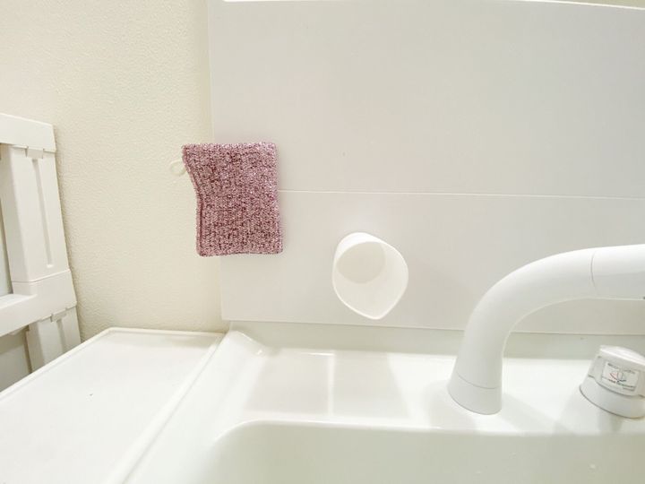 吸盤式コップはダイソーで購入し、セリアで購入したスポンジキャッチを使っていつでもすぐに拭き掃除ができるようにスポンジを引っ掛けてあります。