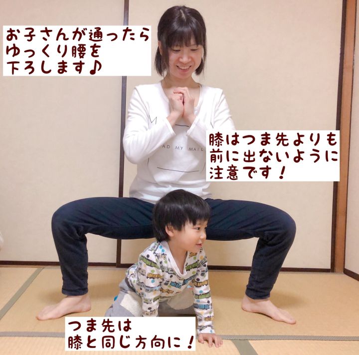 お子さんが一緒にいる場合、大きく開いた脚の間をトンネルのようにくぐってもらいましょう!