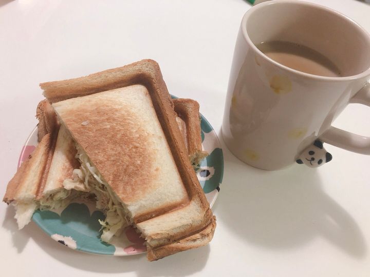 こちらの写真のホットサンドは、前日の残り物のキャベツとツナのサラダ入りのもの。