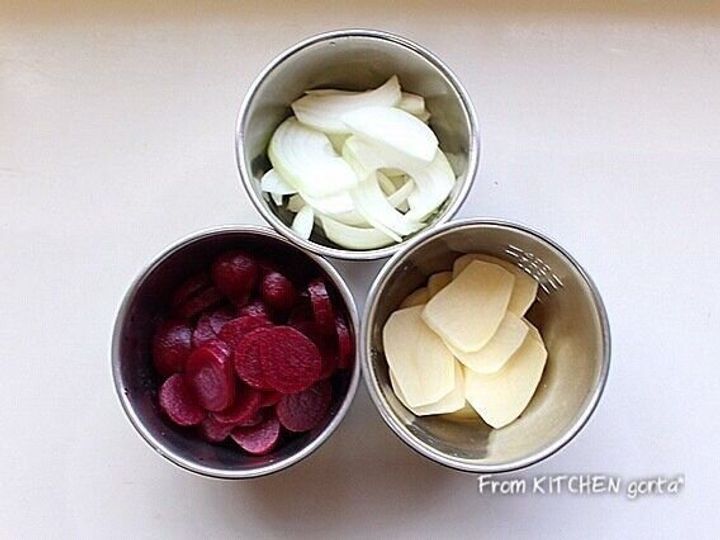 (1)ビーツ、じゃがいも、玉ねぎをスライスして、下準備しておく。