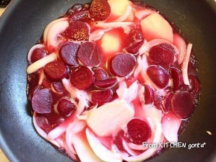 (3)先ほどの炒め上がった鍋に、ビーツとAを加えて沸騰させる。