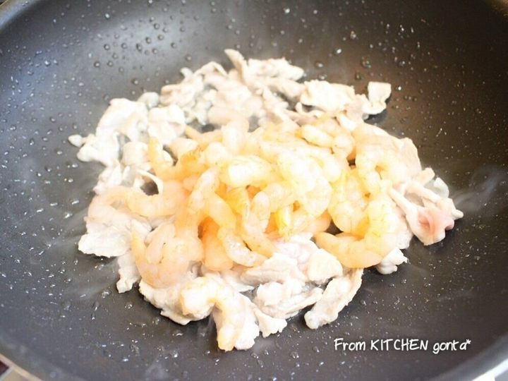 (3)フライパンに油(分量外)を入れて、豚スライス肉と、エビを炒める。