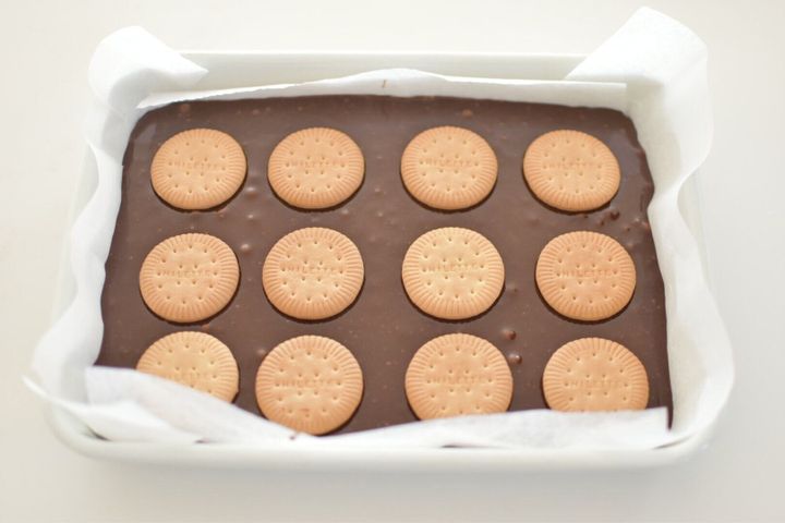 3.バットに生地を流し入れたら、お好みのビスケットを並べてオーブンで約20分焼きます。