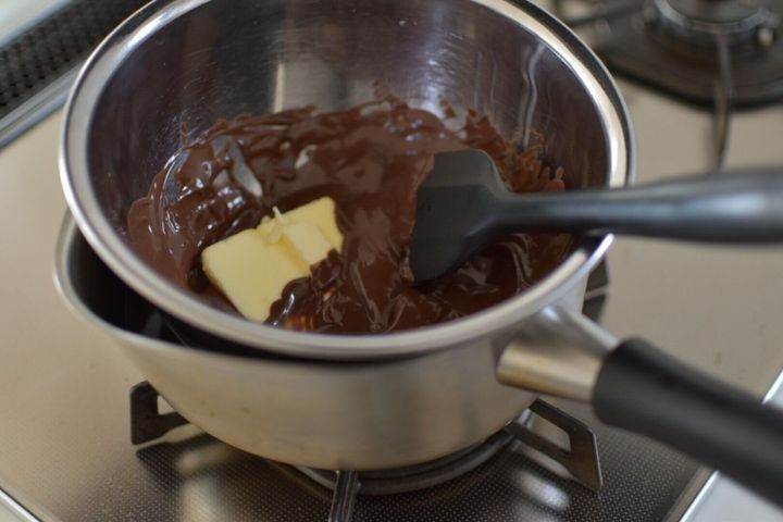 1.鍋かフライパンにお湯をはり、チョコレート、バターを入れたボウルを湯せんで溶かします。