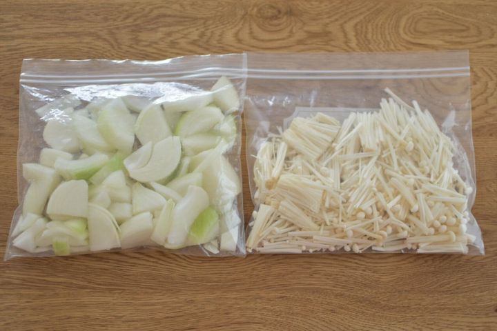 玉ねぎ、えのき、うす揚げは食べやすいサイズにカットして冷凍しています。