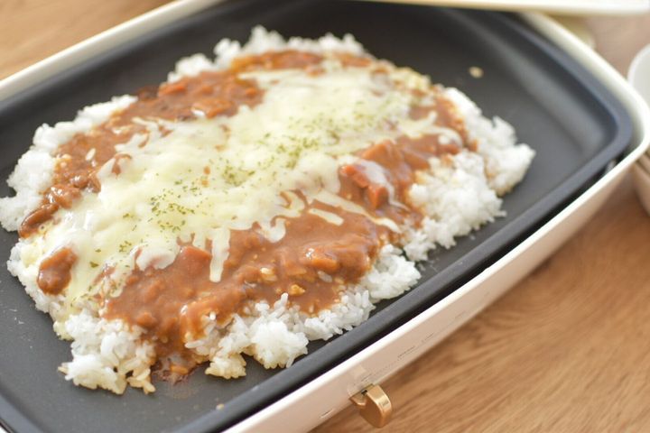 耐熱皿にご飯とカレーを盛り付けてチーズをたっぷりと広げます。トースターや魚焼きグリルで表面がこんがり焼き目がついたら完成!茹でたほうれん草やスライスしたゆで卵をトッピングしても。ぜひ熱々の状態で食べることをおすすめします。ホットプレートで家族分をまとめて作っても楽しく食べられますよ。