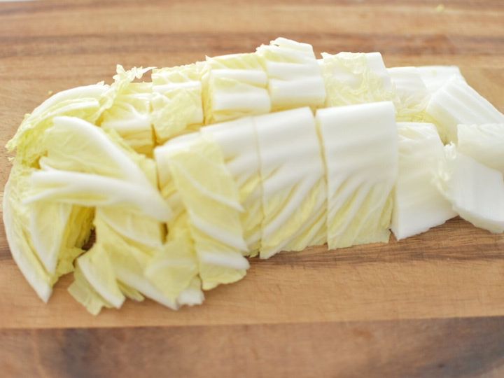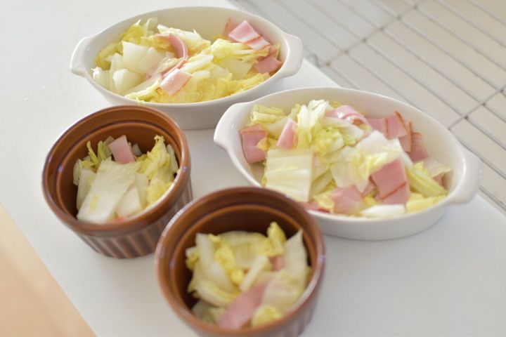 食べやすいサイズにカットした白菜は、あらかじめレンジで加熱してしんなりさせておきます。