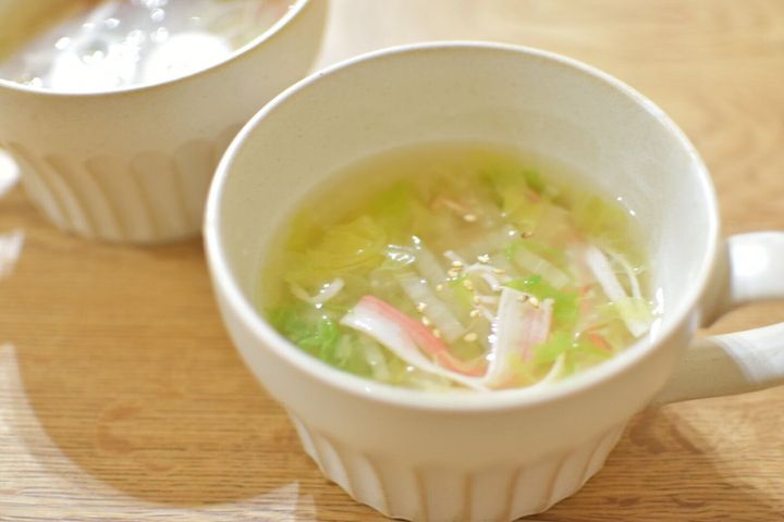 細めに刻んだ白菜とカニカマをほぐしながらスープにします。味付けは鶏ガラスープか中華スープなどお好みで。香りが飛んでしまうのでごま油は仕上げにふりかけるのがポイントです。