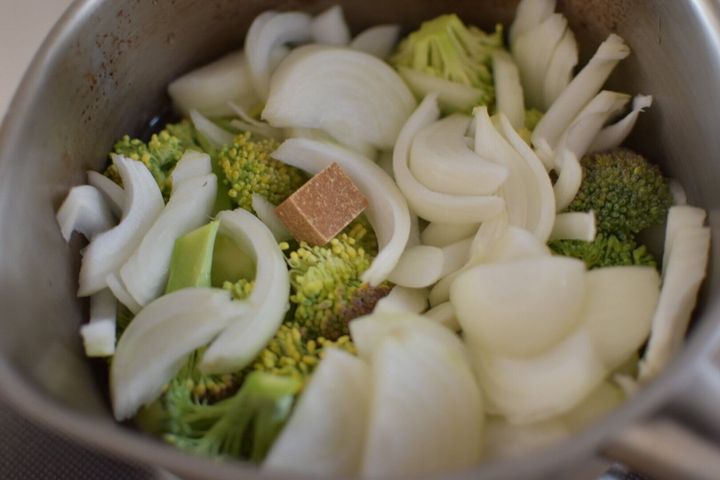 ②鍋に玉ねぎ、ブロッコリーを入れたら、容量の1/3を目安に水を加えます。コンソメ1個も加えて野菜がくたくたになるまで煮込んでいきます。水分が少なくなったら随時足します。
