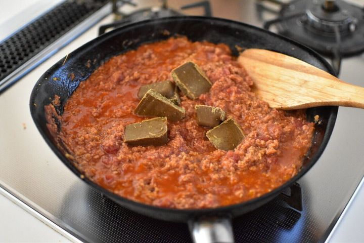 3.ひと煮立ちしたら弱火にしてカレールウを加える。焦げないようにかき混ぜながら溶かしていく。カレールウがなじんだら、好みの水加減になるまで水を加える。