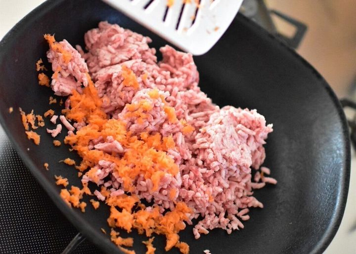 1.フライパンに油脂をひかずに合いびき肉を入れる。にんじんは皮ごとすりおろし、玉ねぎは皮をむき直接すりおろして加える。