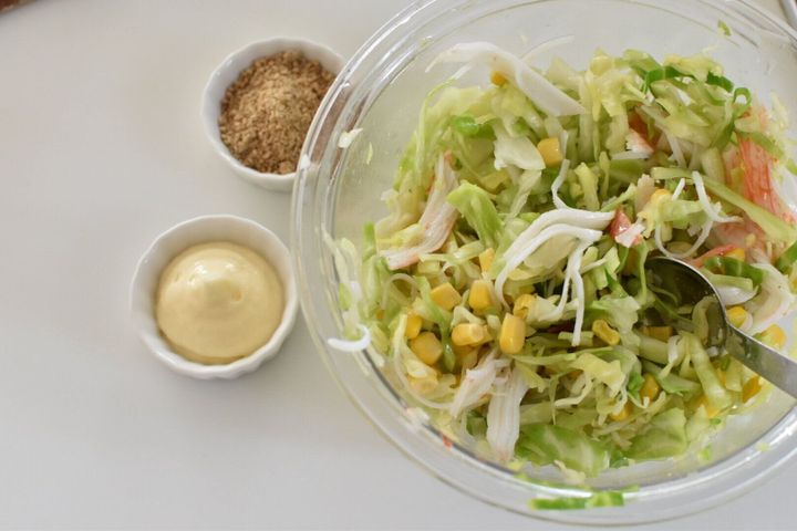 キャベツをたっぷり食べられるサラダです。ほぐしたカニカマが入ると食べ応えもUP!