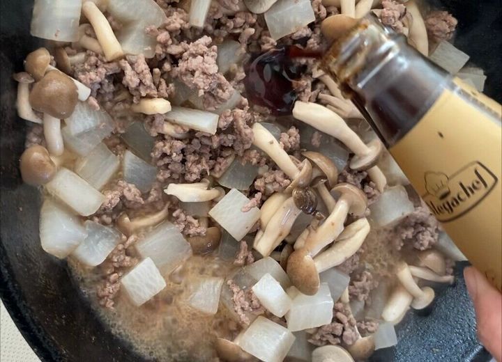 2.フライパンを中火で加熱し、合いびき肉を入れてしばらく炒めて8割ほど色が変わったら、しめじ、加熱した大根を加える