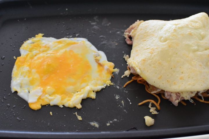 隣の空いたスペースには卵を落とします。目玉焼きでもいいですが潰しています。