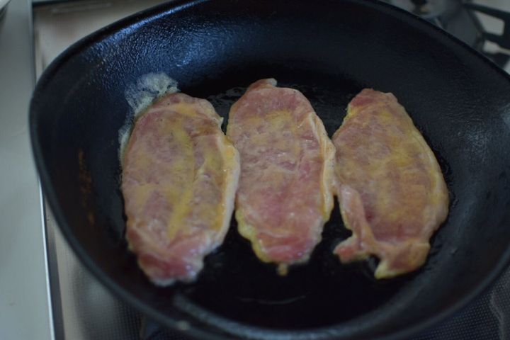 卵を溶いたら、小さじ1/2ほどの片栗粉を加えて豚肉を絡めて焼いていきます。