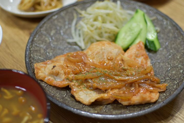 油を引いたフライパンでスライスした玉ねぎを焼き、しんなりしたら取り出して豚肉を焼く。