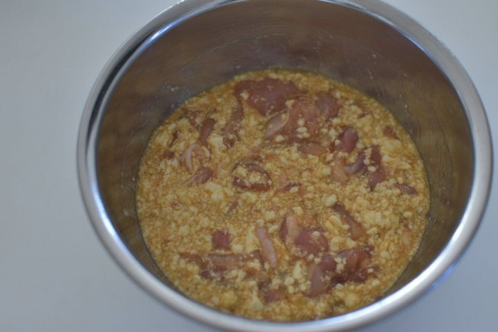 まず、鶏もも肉は皮を取り除いて小さめに切ってください。