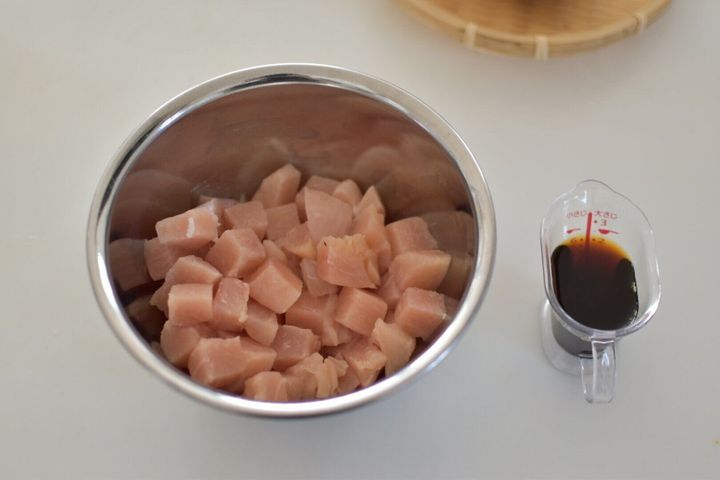 まず、鶏むね肉は皮を取り除いたら1㎝程に切って酒と醤油に漬けておきます