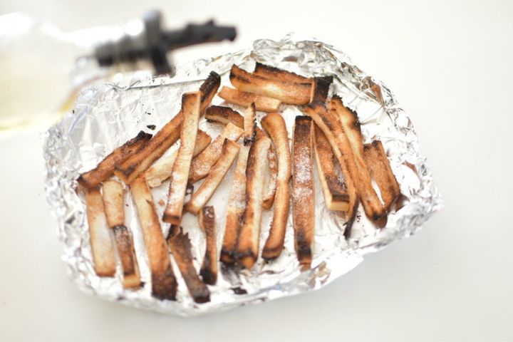 見た目の印象は大差ありませんが、焼く前に油をまぶしていた方が均等に焼き色が付いています。