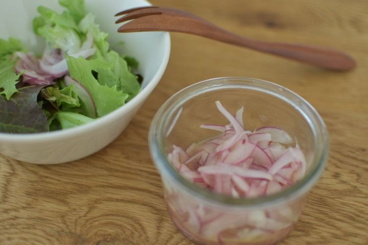 最近はレッドオニオンにはまっています。酢漬けにすると全体がピンク色に染まるもの可愛い。そのままサラダにスライスして乗せても映えますよ。