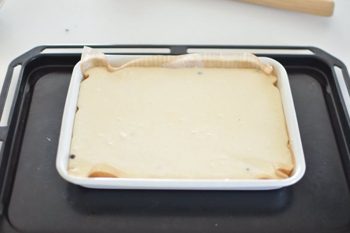 オーブンシートを敷いた上に敷き詰めたら、生地をゆっくり流し入れます。