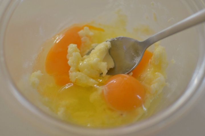 続いて卵を加えたら、バターを加えてよく混ぜます。バターの塊を潰すように馴染ませますが、塊が残っていてもOK。