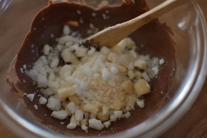 袋の中で細かく砕いたら、溶かしたチョコレートに混ぜ合わせるだけ。