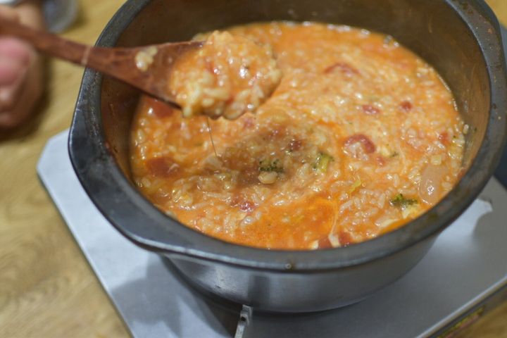 ご飯とチーズをたっぷり入れたトマトチーズリゾット。