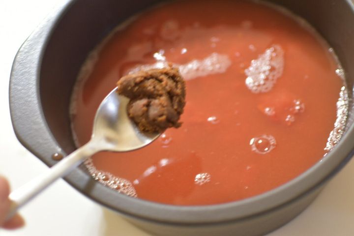 トマト缶を鍋に全量加えたら、そのまま缶で同量のお水を加えてくださいね。