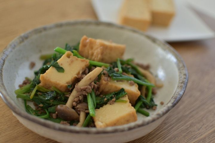 挽き肉だけでは物足りない野菜炒めも厚揚げを追加するとメインにもなります。