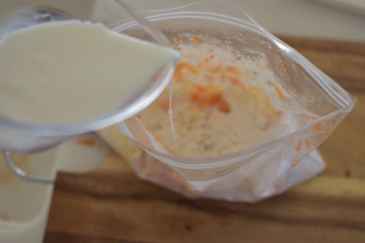 ホットケーキミックス、卵、牛乳(豆乳)を袋に合わせたら、人参を皮ごとすりおろします。