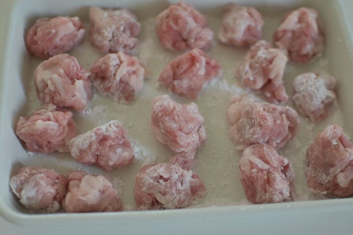 ぎゅっと丸めたら、片栗粉をまぶして使用します。
