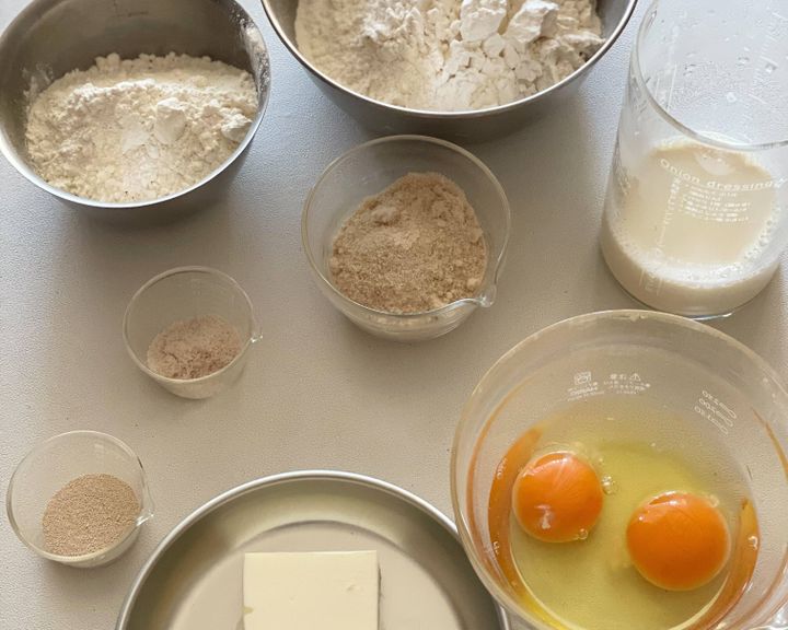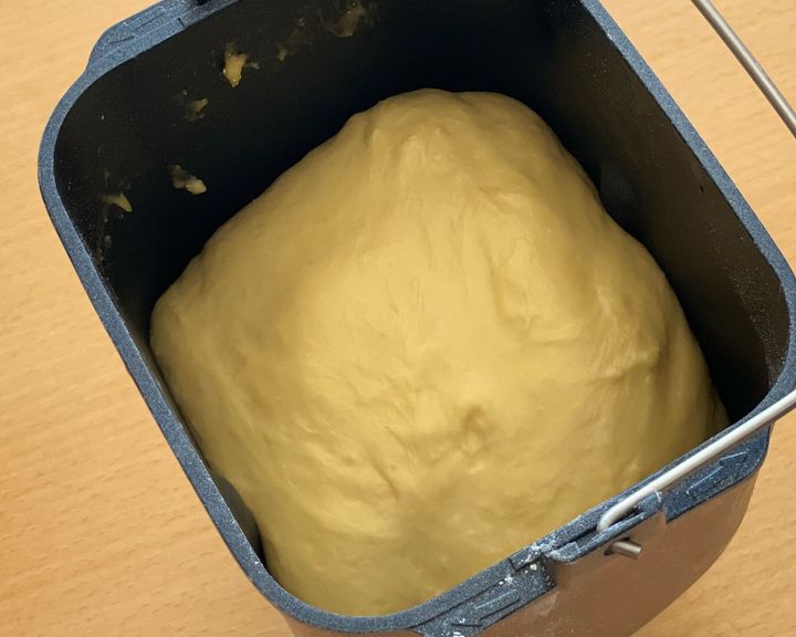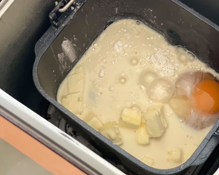 ①ホームベーカリーの容器に強力粉(カメリア)・薄力粉((フラワー)・上白糖・塩・無塩バター(常温)・卵(常温)・豆乳(40度)を入れ、ドライイーストを入れる場所にセットして一次発酵まで行う。