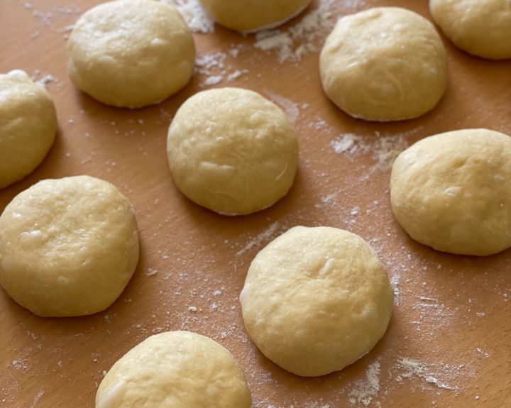 ・12等分した生地を手のひらに打ち粉をしてから丸め、閉じ目はしっかりとつまんでくっつける。