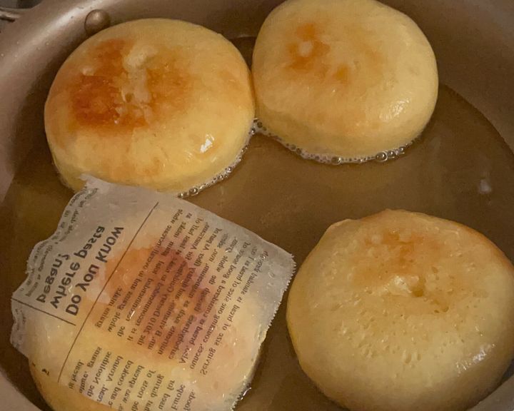 (生地がふっくらと膨らみ、色が濃くなりすぎないように気をつけながら揚げる)