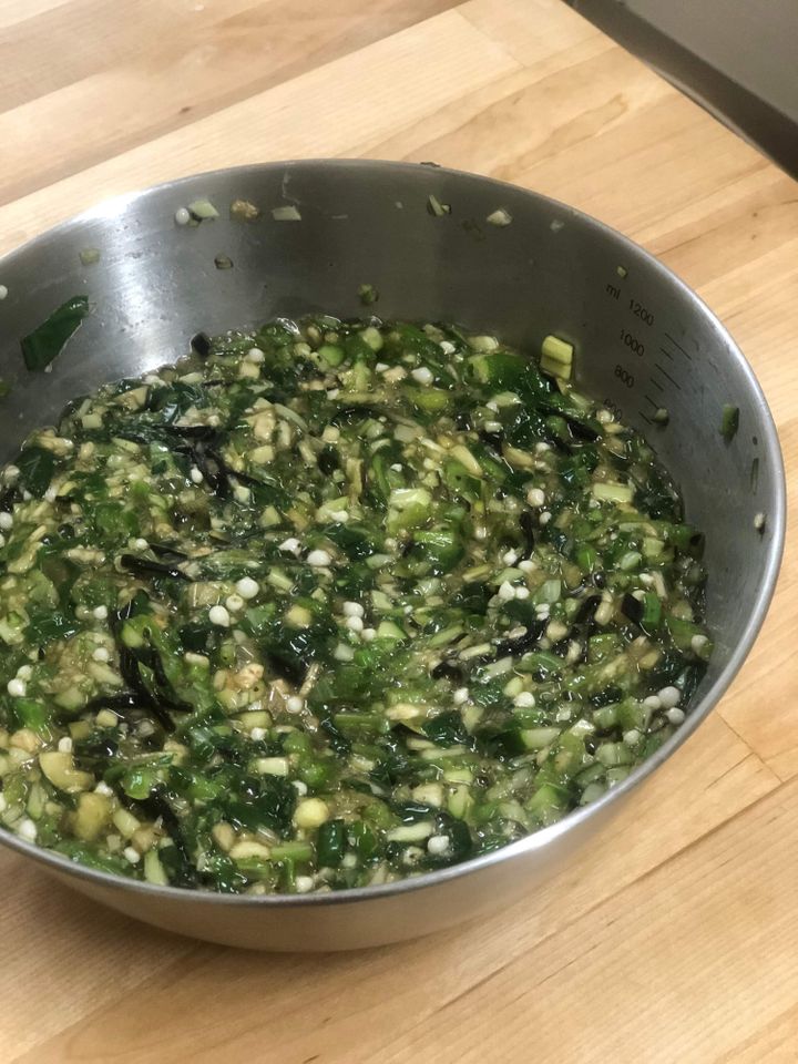 ・オクラ 水で洗って、まな板で塩を振って板ずり、沸騰したお湯で軽く湯がいて、ざるにとり水気を切ってみじん切り