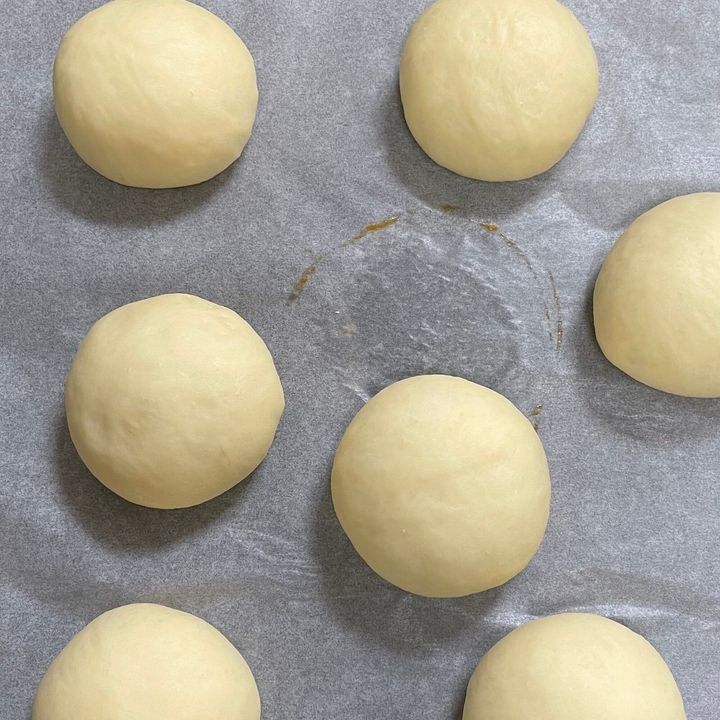 6)オーブンシートをオーブンのトレーに敷いておき、ベンチタイムが終わった生地を丸め直して、トレーの上に並べます