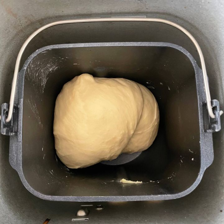 1)バターは1センチ角くらいにカットし、計量した材料をホームベーカリーに入れます、イーストは別に投入する機種であればイーストを入れて、一次発酵をスタートします。