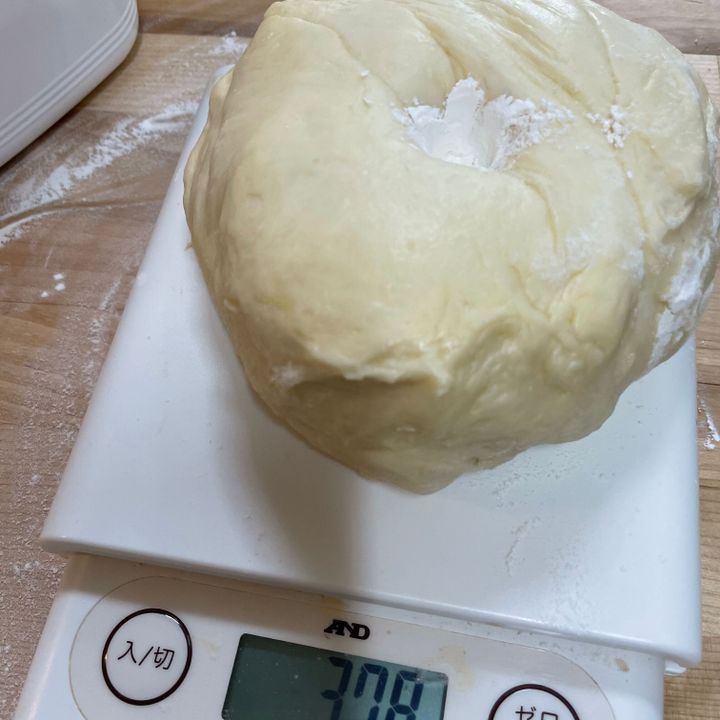 2)一次発酵が終了したら、ホームベーカリーから生地を取り出し、軽くガス抜きしたら全体量をはかってみてください。