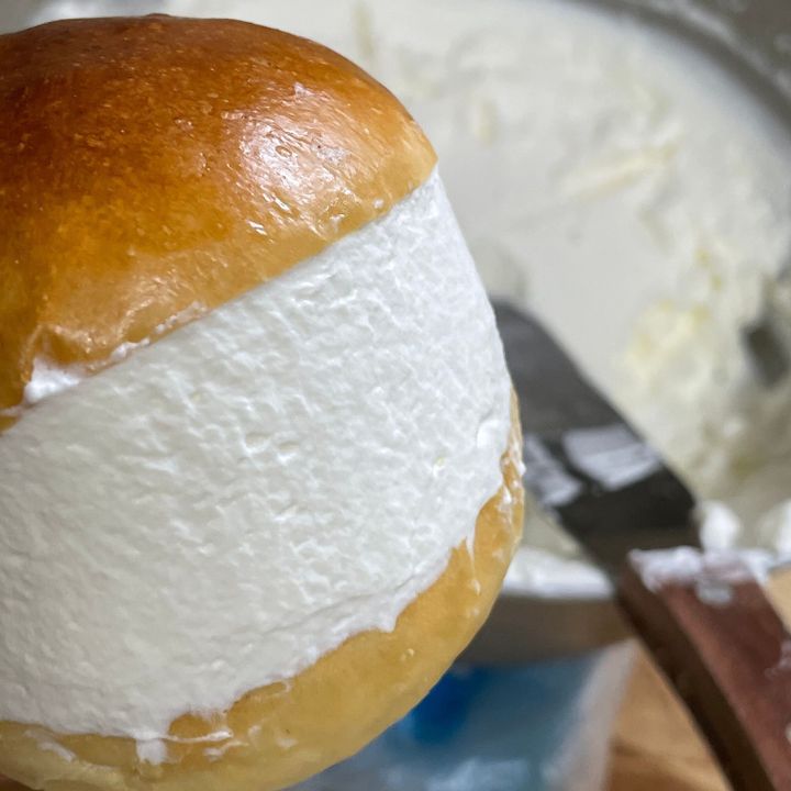 13)パンを開き気味にして生クリームをたっぷりと挟んだら、パレットナイフナイフを使ってクリームの表面をならします。