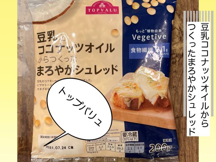 先日買い物に行った時に『豆乳とココナッツオイルからつくったまろやかシュレッド』を乳製品のシュレッドチーズの隣に発見しました。