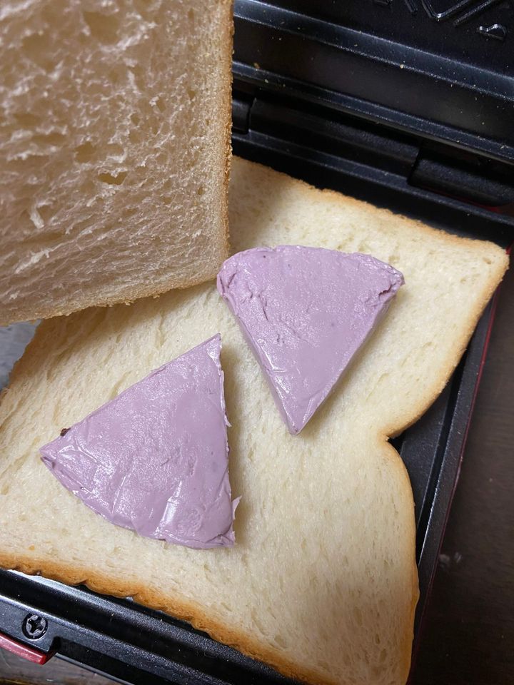 その上にクラフト 小さなチーズケーキ ブルーベリー2つを挟んでとろけるチーズをはみ出さない程度広げもう一枚の食パンで挟んで焼きあがれば完成です。